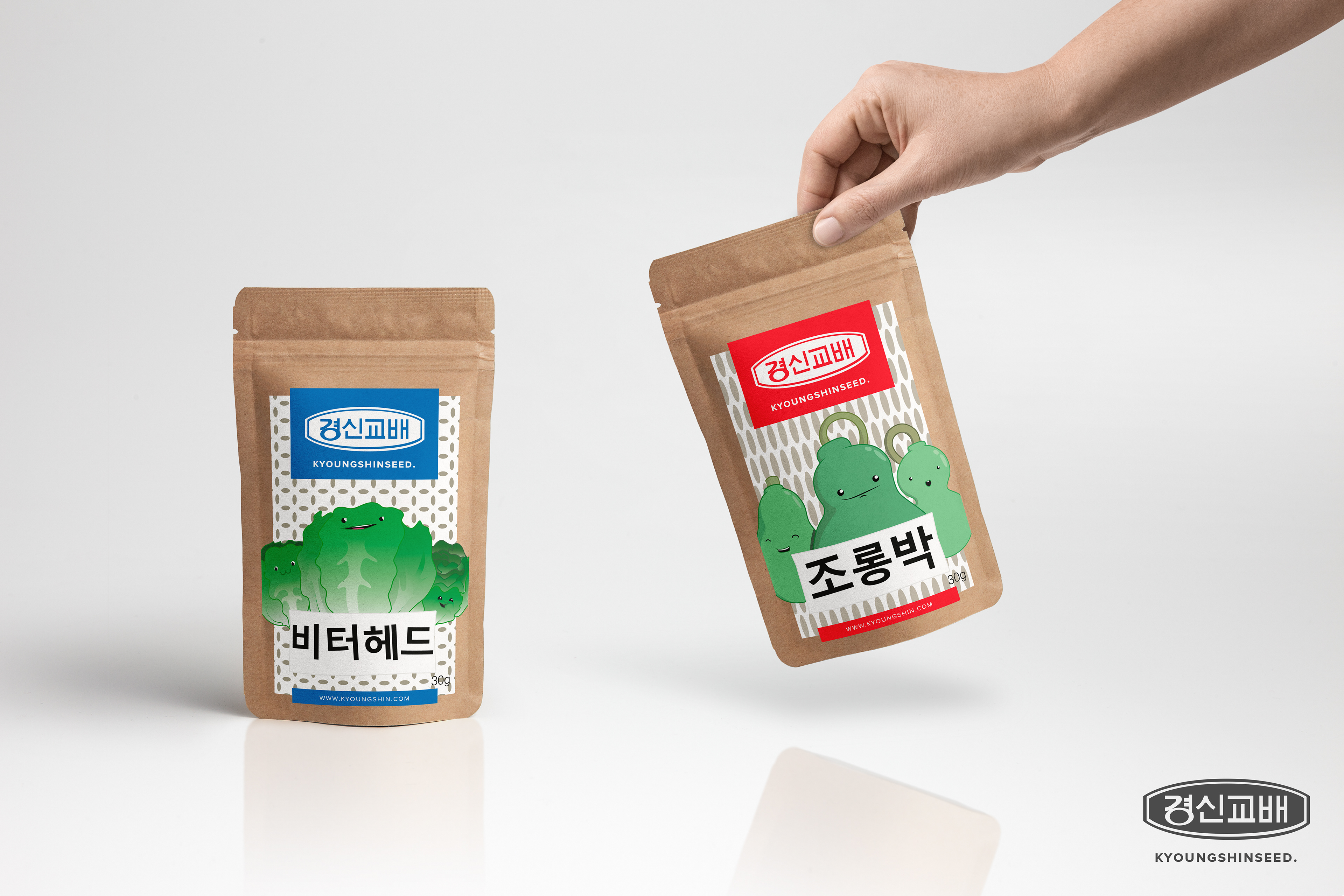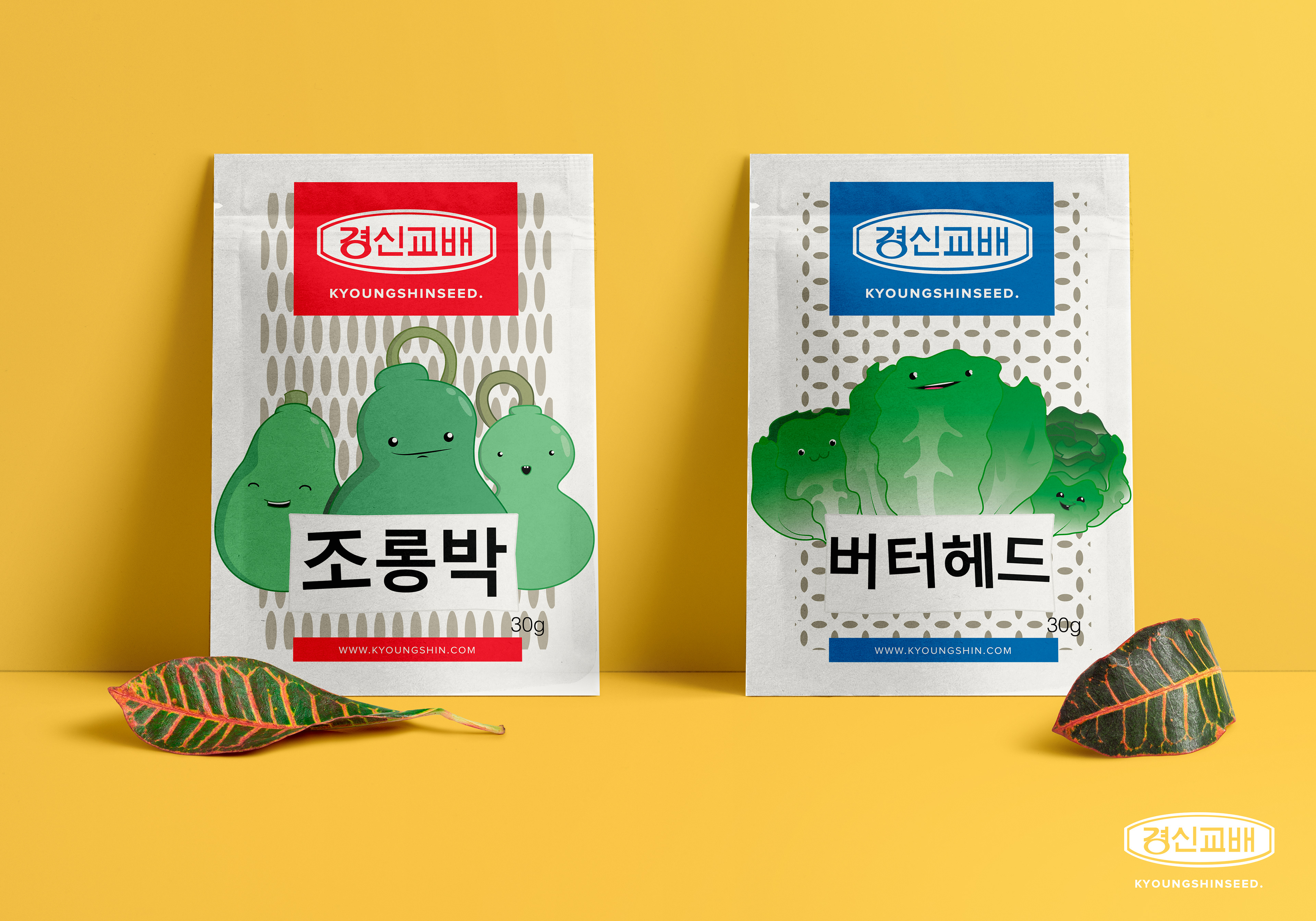 The seed company, Kyoungshinseed, wanted to have a fresh new packaging to attract younger costumers. I created characters for two vegetables: lettuce (피터헤드) and calabash (조롱팍).